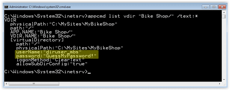 C:\Windows\System32\inetsrv>appcmd list vdir "Bike Shop/" /text:usernameC:\Windows\System32\inetsrv>appcmd list vdir "Bike Shop/" /text:password